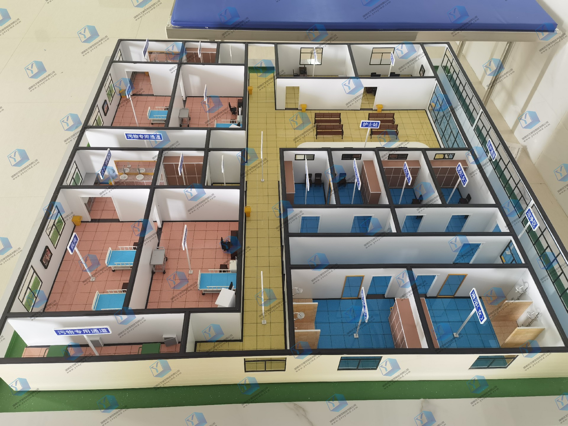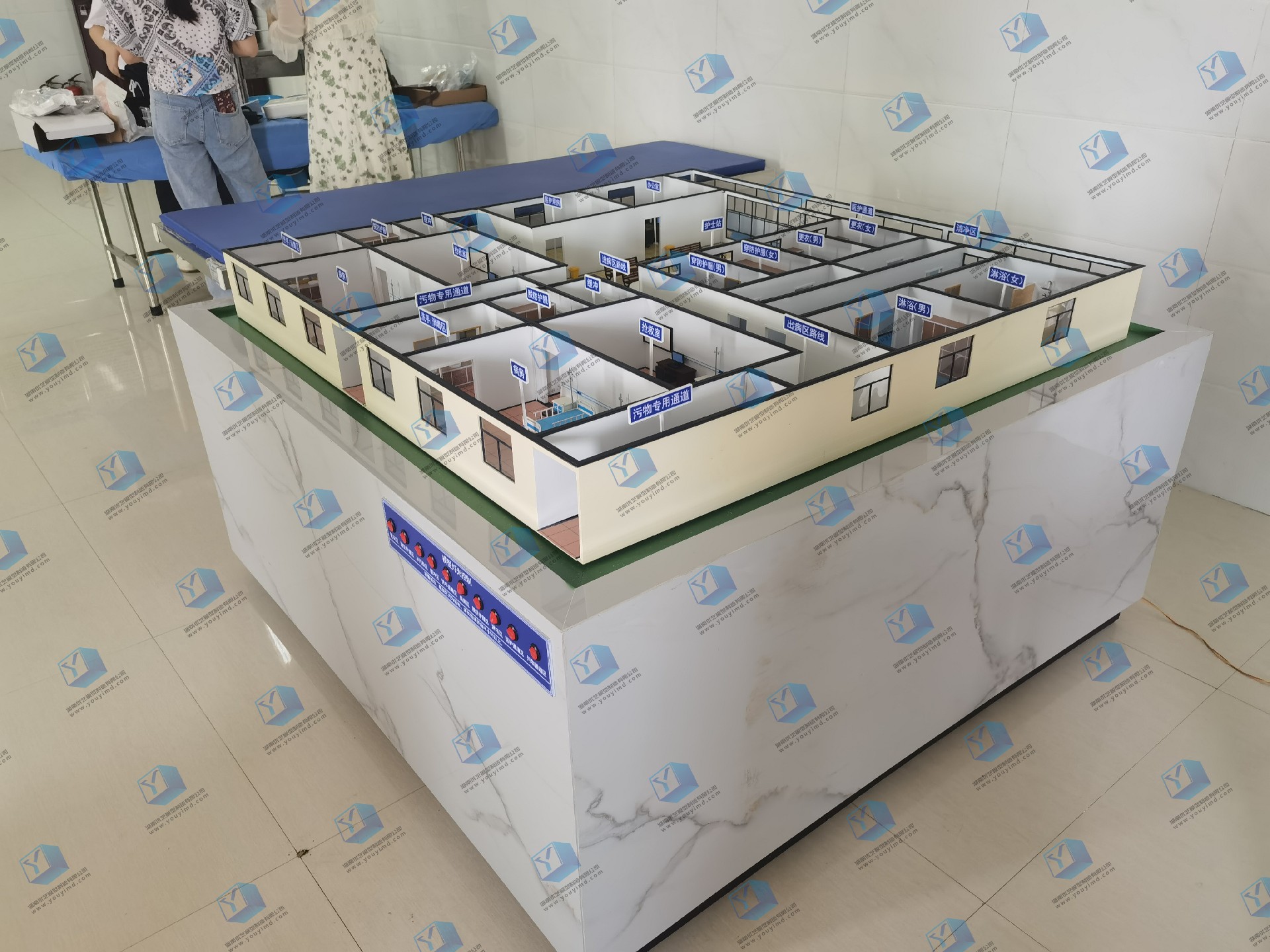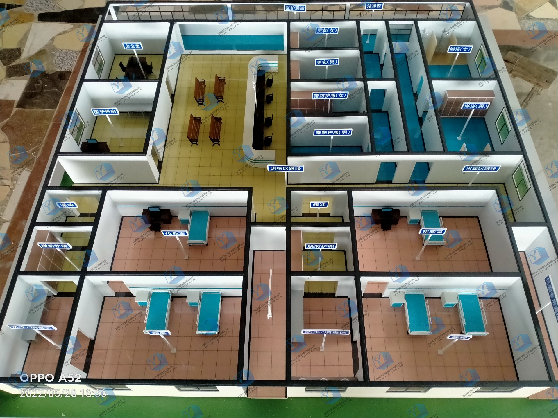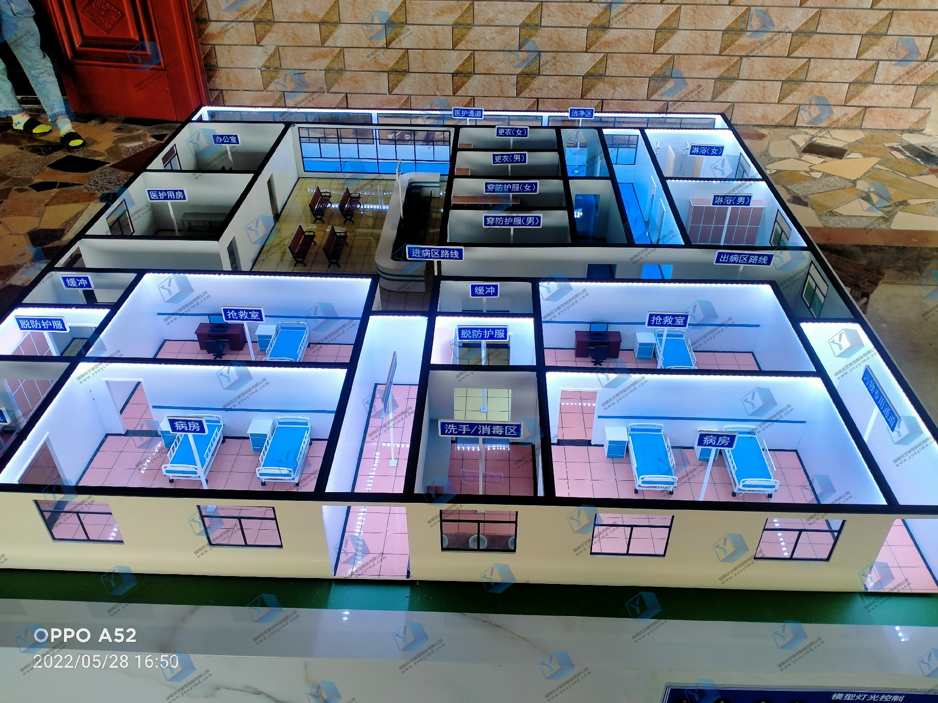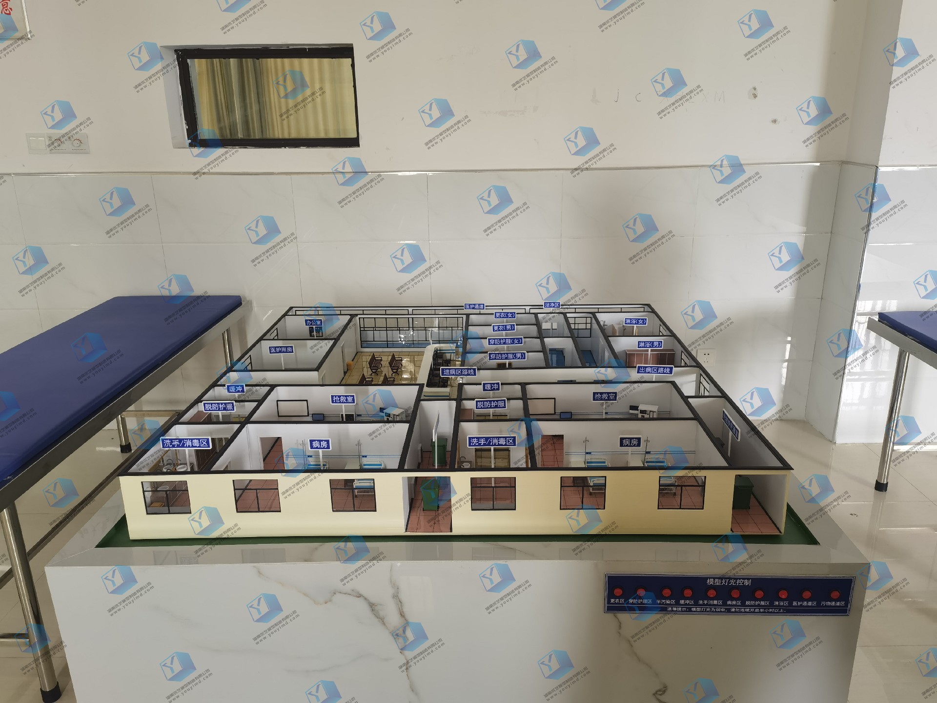 醫院感染科工作流程沙盤模型根據典型醫院感染科樓層布局設計制作, 主要包含病房、 醫生通道, 清潔區, 半污染區, 污染區, 污物通道(患者通道), 每個區域內制作出對應的設備模型, 每個區域內的單獨功能模塊采用單獨燈光控制共約 12 套燈光控制,方便老師與學生在沙盤上扮演角色, 進行工作流程演示, 如醫生角色工作流程沙盤上可以單獨控制每個經過的工作區域燈光被單獨點亮, 便于老師講解每個區域的知識點, 學生可直觀的看到所講的功能區域內的設備布局與工作流程。