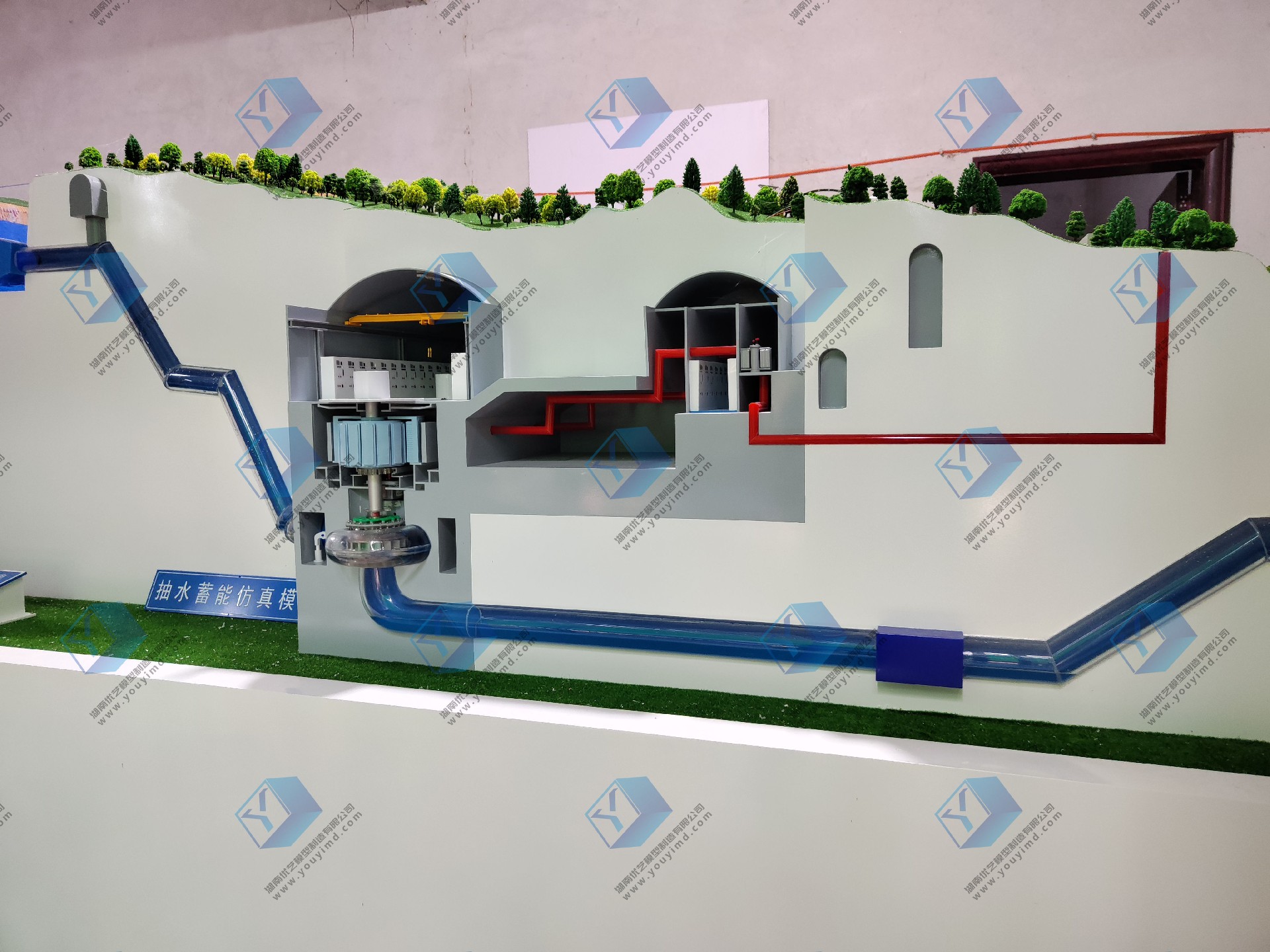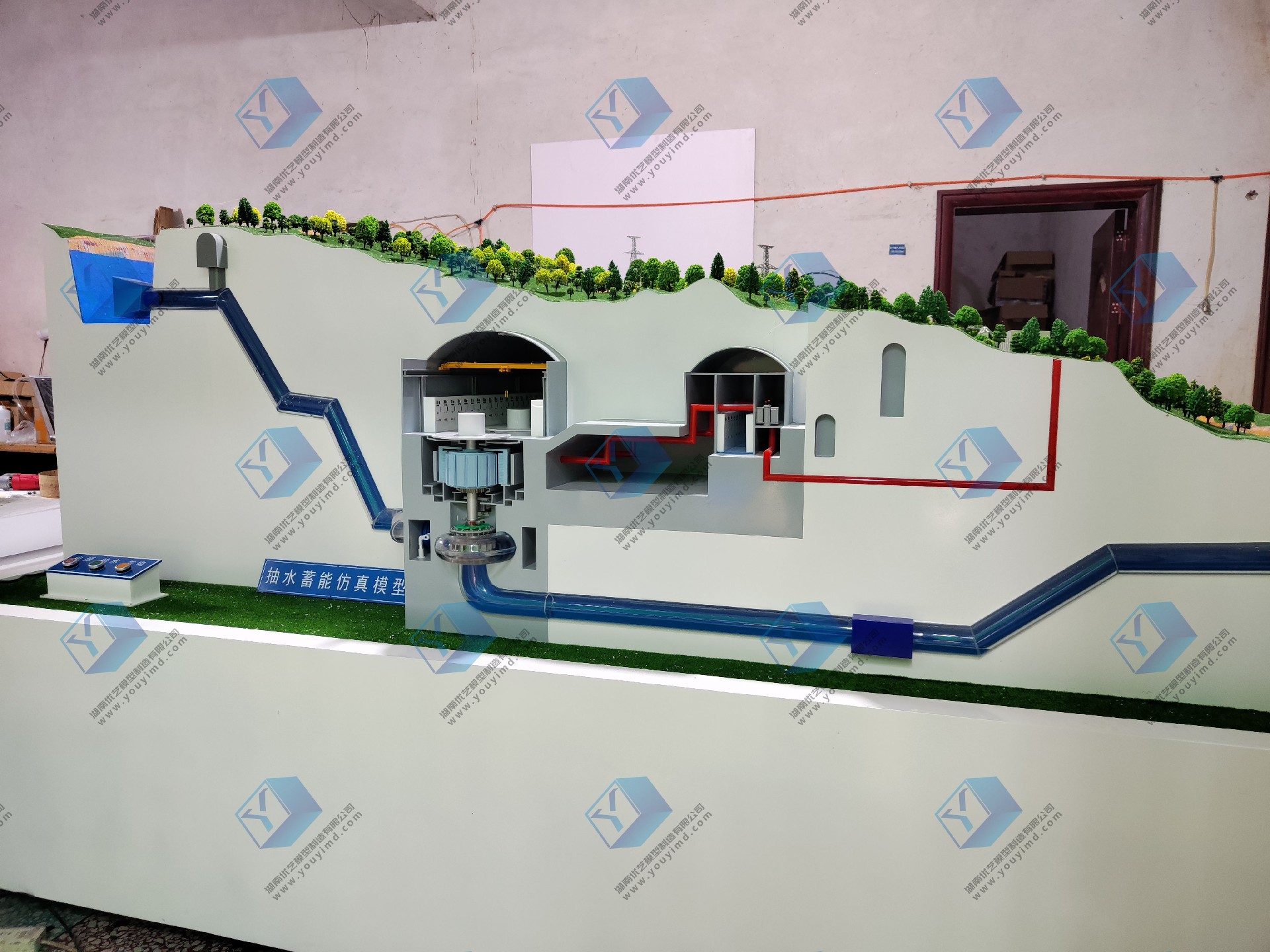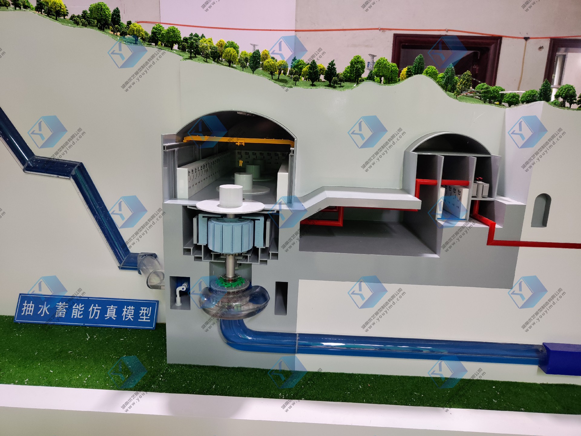 抽水蓄能水電站動態剖面結構仿真模型, 是湖南省優藝模型研發 、設計、制作的仿真教學實訓設備, 設備長 4米 寬1.2米。整體采用空面結構展示, 展示出上水位、 地下廠房、水輪發電機、下水位、 地面部分制作出山體地形綠化、鐵塔電能輸送線路等。 設備整體采用真實過水、 模擬進水管道、 渦殼尾水管等采用透明結構, 內部真實過水 和LED燈光動態模擬水流流向 、通過自控技術實現抽水原理演示、 發電原理演示、 實現水輪機正反轉、水流反向流動 、實現 抽水蓄能水電站工作原理動態演示。 適用于教學實訓科普展覽等