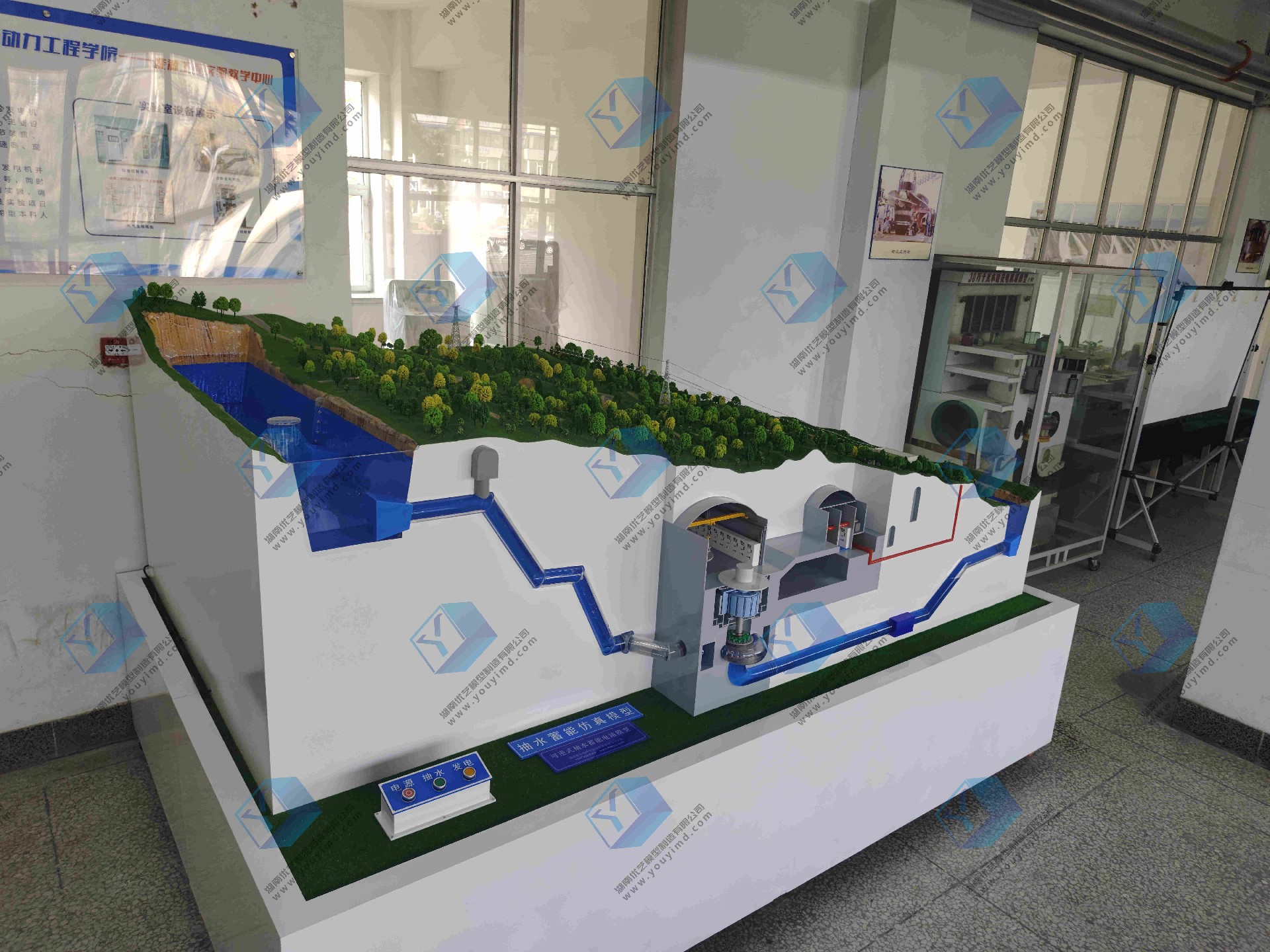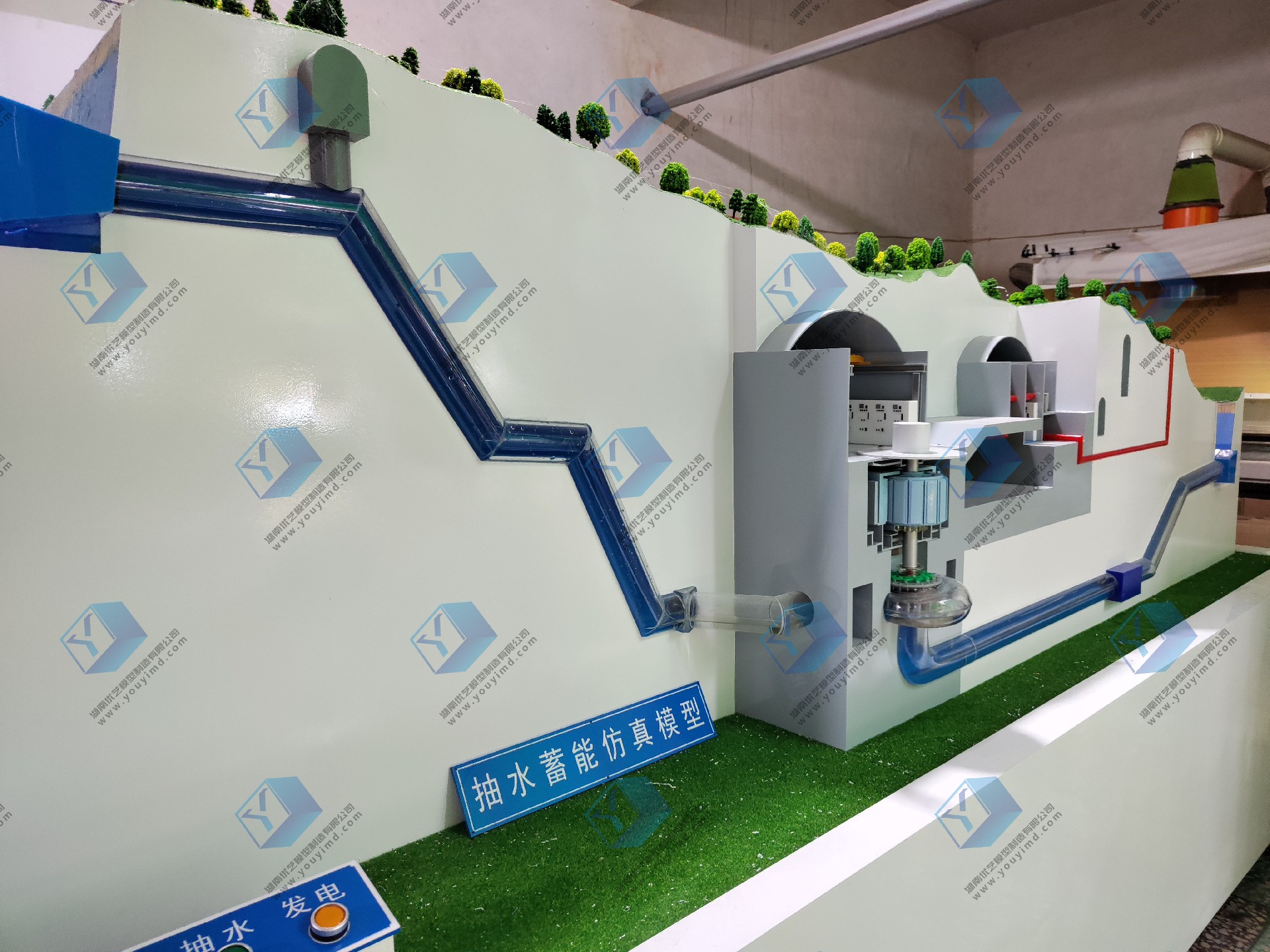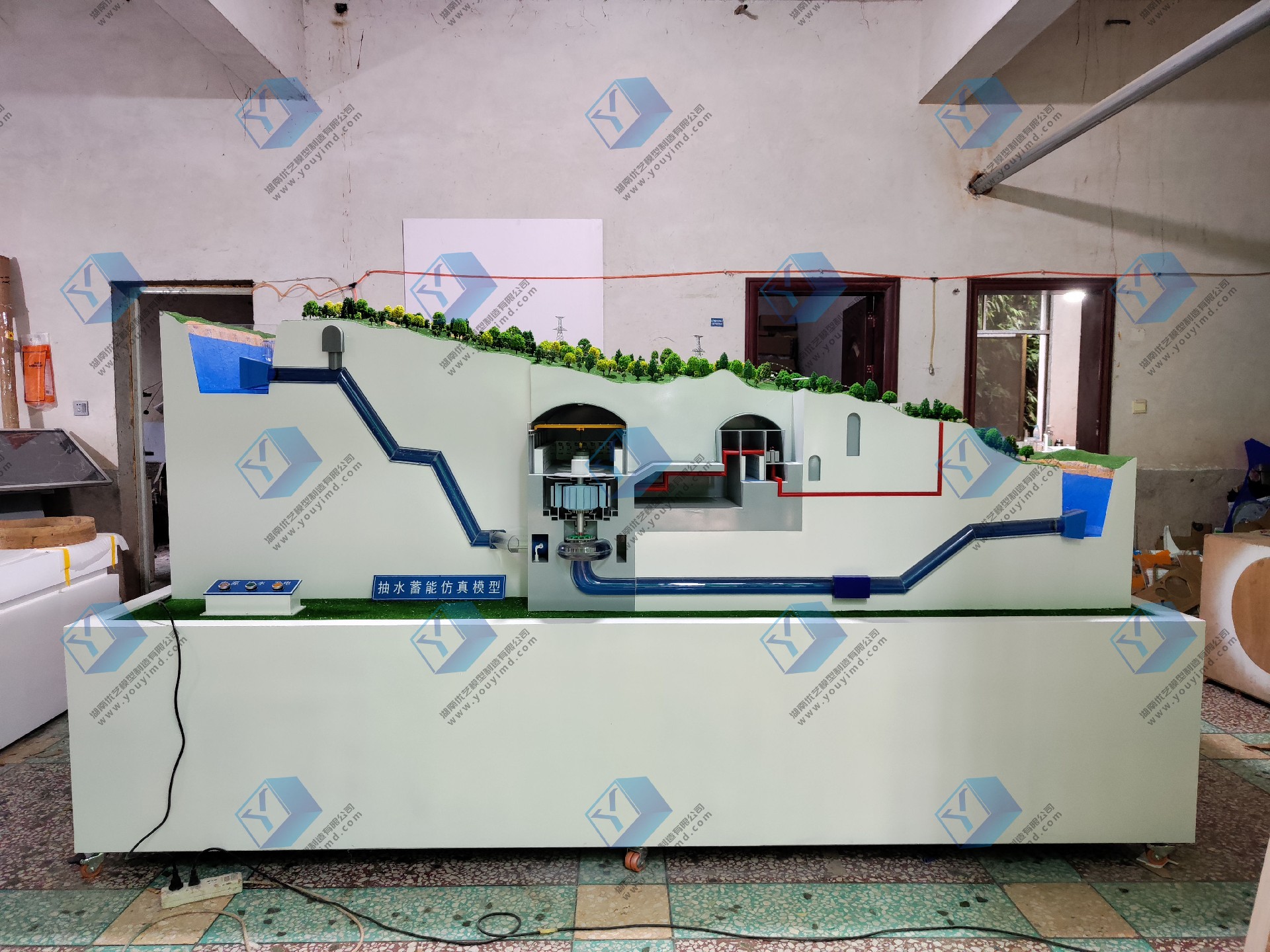 抽水蓄能水電站動態剖面結構仿真模型, 是湖南省優藝模型研發 、設計、制作的仿真教學實訓設備, 設備長 4米 寬1.2米。整體采用空面結構展示, 展示出上水位、 地下廠房、水輪發電機、下水位、 地面部分制作出山體地形綠化、鐵塔電能輸送線路等。 設備整體采用真實過水、 模擬進水管道、 渦殼尾水管等采用透明結構, 內部真實過水 和LED燈光動態模擬水流流向 、通過自控技術實現抽水原理演示、 發電原理演示、 實現水輪機正反轉、水流反向流動 、實現 抽水蓄能水電站工作原理動態演示。 適用于教學實訓科普展覽等