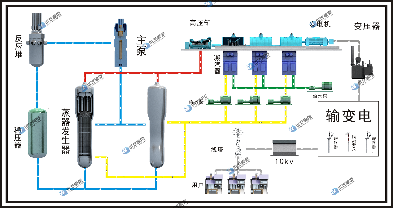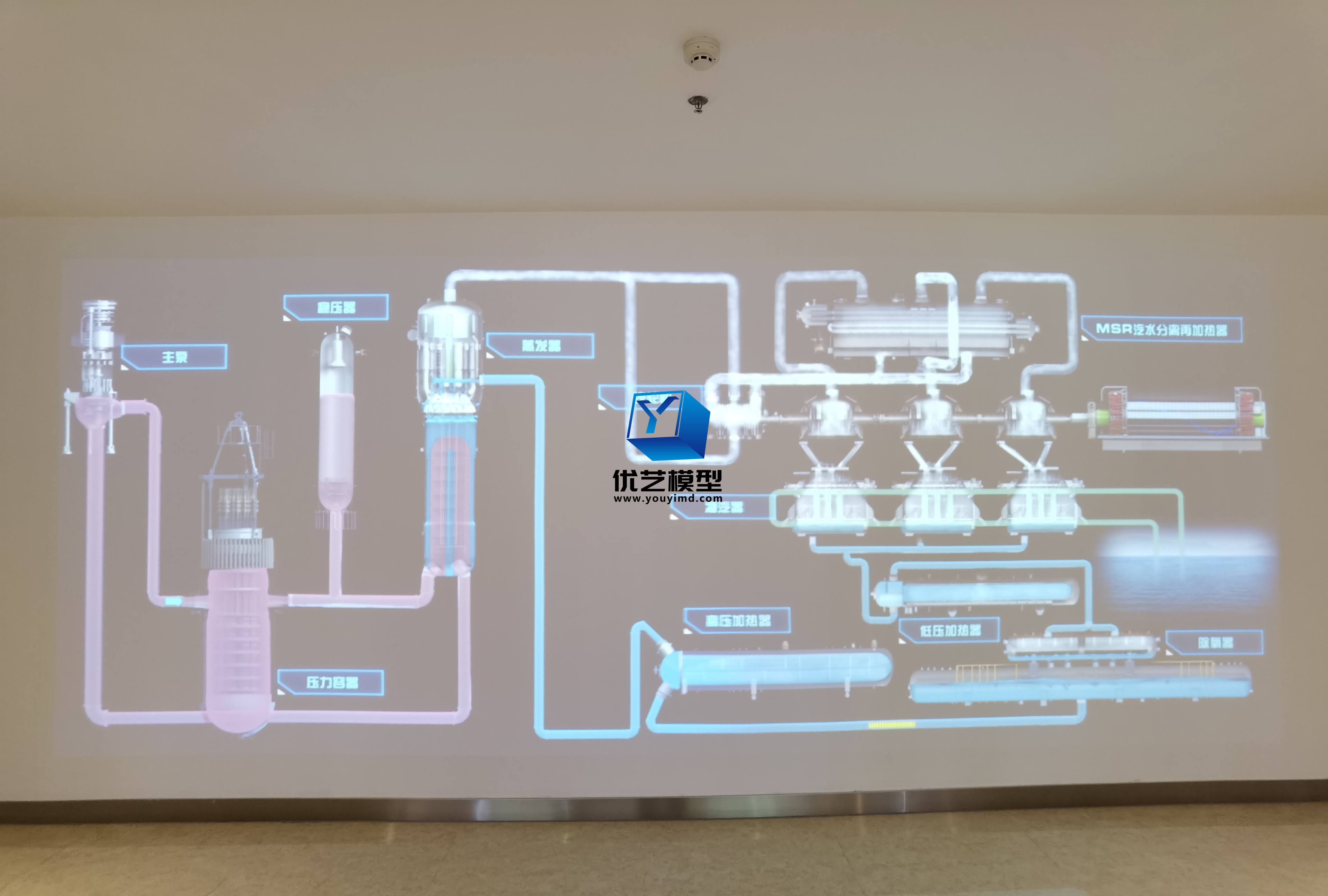 該模型設(shè)計(jì)了15個(gè)控制點(diǎn),分別為一次回路;二次回路;汽輪機(jī)檔位1,汽輪機(jī)檔位2,汽輪機(jī)檔位3,隔離開關(guān)1,斷路器,隔離開關(guān)2,電力輸送,10kv變電房,用戶,環(huán)境............等!展現(xiàn)了從核島至用戶的核電產(chǎn)生,傳輸,入戶的完整工藝流程,主要其展現(xiàn)了其中任意環(huán)節(jié)出現(xiàn)安全風(fēng)險(xiǎn)后,帶來的對(duì)應(yīng)效果,及備用措施............等!