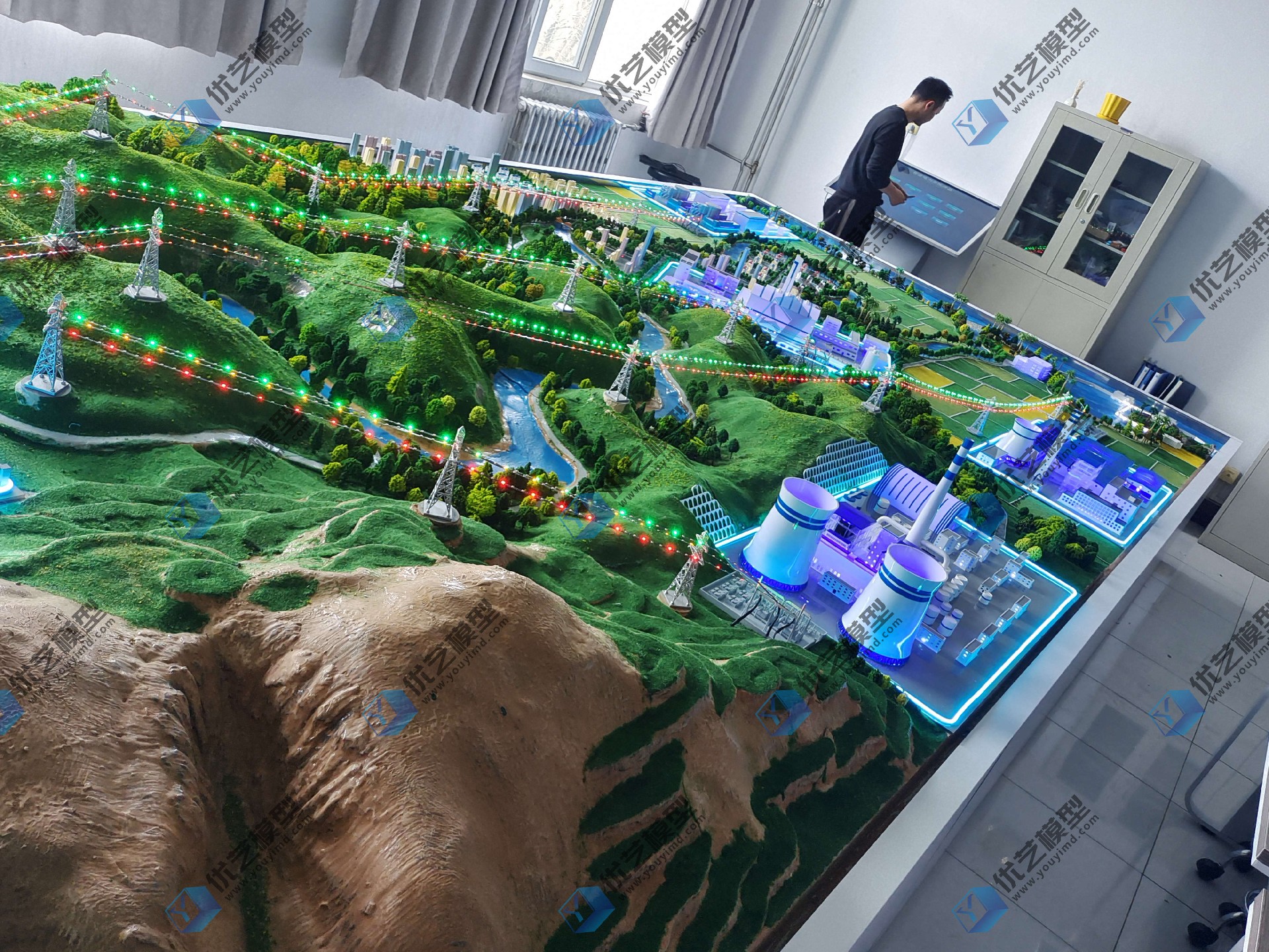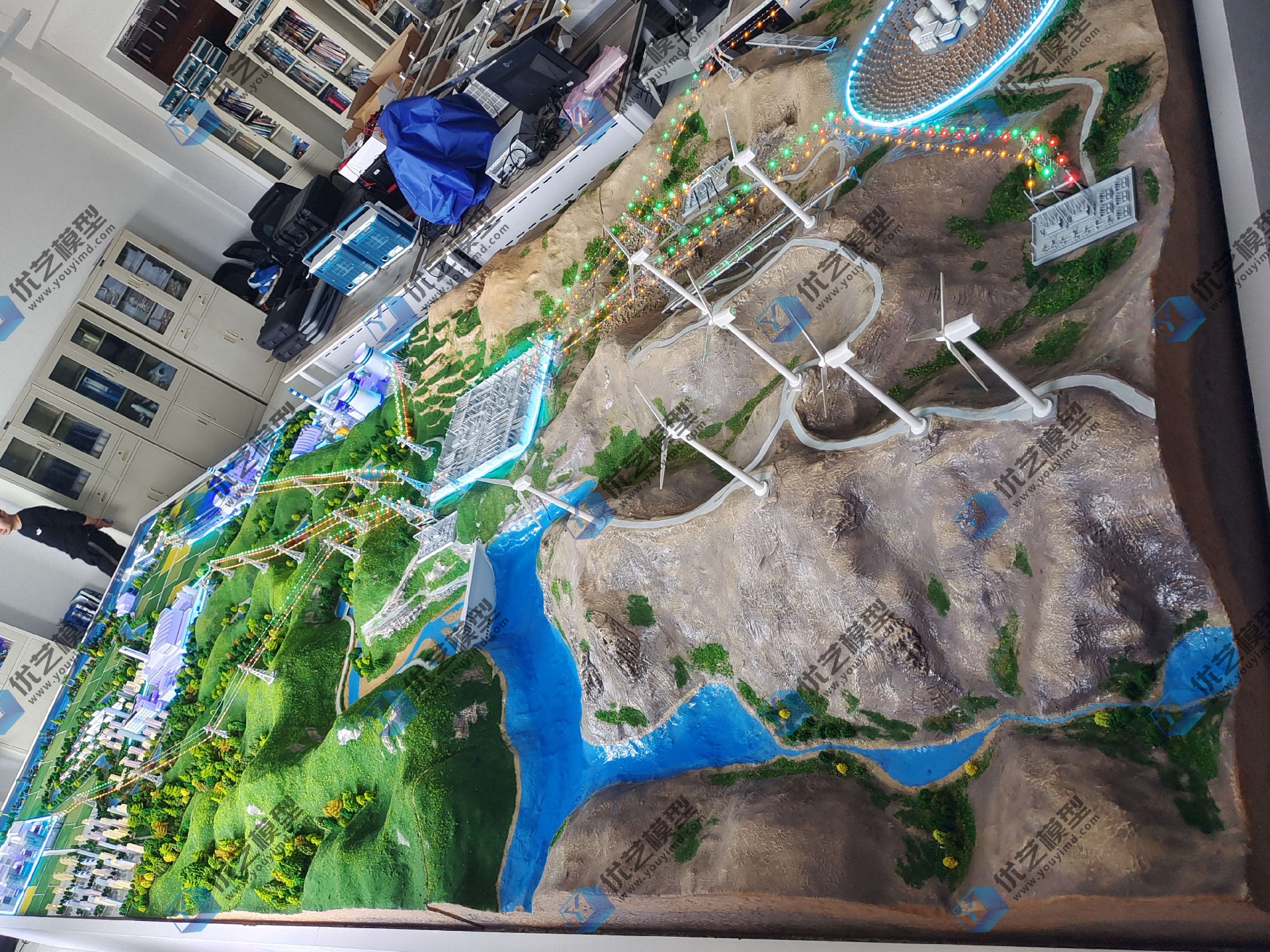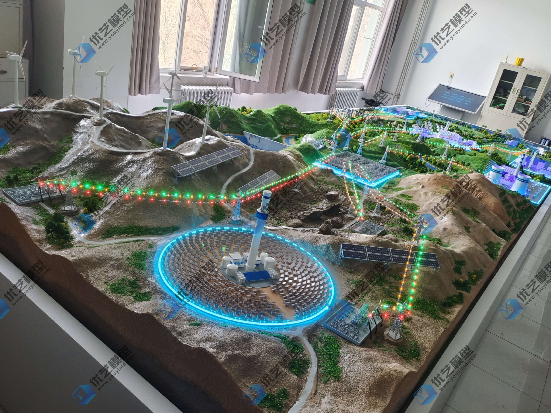 模型功能介紹:綜合新能源電力系統沙盤,是由湖南省優藝模型制造有限責任公司與青海大學共同研發定制產品,模型尺寸為8米乘以3米,主要制作出:火力發電模塊:展示傳統的燃煤發電站的結構和工作機制。通過三維動畫展示燃燒過程和蒸汽循環發電的過程。風力發電模塊:包含風力發電機(風車)的模型,通過三維動畫詳細講解風力發電機結構元發電原理。太陽能發電(光伏、光熱)模塊:通過模型和動畫演示如何從太陽光直接生成電力。水力發電模塊:展示水輪機和水壩的模型,并通過動畫解釋水力發電的結構與原理。核電站模塊:通過模型與三維動畫結合核電站的結構和原理,垃圾發電模塊:展示垃圾焚燒發電的過程。潮汐發電模塊:通過模型展示利用海水潮汐運動來驅動發電機的原理。生物質發電模塊:解釋和展示如何從農業廢物、木材碎片等生物質資源中提取能量進行發電,輸變電模塊:展示從發電站到用戶家庭的電力傳輸和變壓過程。模塊與模塊之間采用LED流水燈動態模擬電能產生與輸送設備采用觸控電腦控制,搭載三維原理動畫視頻同步演示講解各類電站的結構、發電原理等,三維動畫包含風力發電原理三維動畫,光伏發電原理三維動畫,水力發電原理三維動畫,核電發電原理三維動畫,火力發電原理三維動畫整個設施采用觸控電腦控制系統,觀眾可以互動選擇查看不同發電模塊的詳細信息和三維動畫視頻,更深入了解各發電技術的工作原理和構造。這種展示方式不僅科技感十足,而且極大地增強了教育和信息傳遞的效果。
